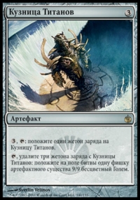 {T}, Remove three charge counters from Titan Forge: Put a 9/9 colorless Golem artifact creature token onto the battlefield.