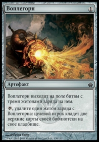 {T}, Remove a charge counter from Shriekhorn: Target player puts the top two cards of his or her library into his or her graveyard.