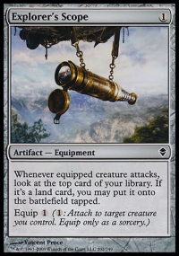 Whenever equipped creature attacks, look at the top card of your library. If it's a land card, you may put it onto the battlefield tapped.