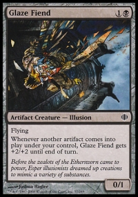 Whenever another artifact enters the battlefield under your control, Glaze Fiend gets +2/+2 until end of turn.