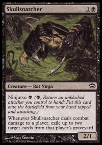 Whenever Skullsnatcher deals combat damage to a player, exile up to two target cards from that player's graveyard.