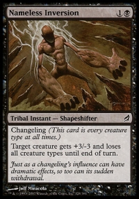Target creature gets +3/-3 and loses all creature types until end of turn.