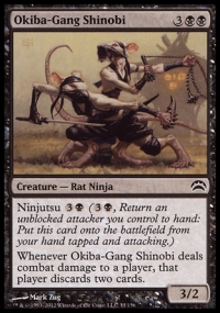 Whenever Okiba-Gang Shinobi deals combat damage to a player, that player discards two cards.
