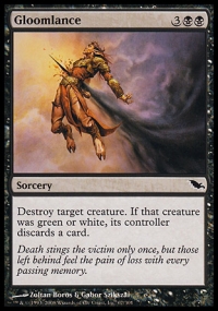 Destroy target creature. If that creature was green or white, its controller discards a card.