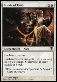 Enchanted creature gets +2/+2 as long as it's a Human. Otherwise, it can't attack or block.