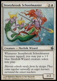 Whenever Stonybrook Schoolmaster becomes tapped, you may put a 1/1 blue Merfolk Wizard creature token onto the battlefield.