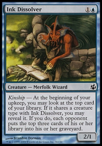 Kinship — At the beginning of your upkeep, you may look at the top card of your library. If it shares a creature type with Ink Dissolver, you may reveal it. If you do, each opponent puts the top three cards of his or her library into his or her graveyard.