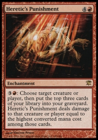 {3}{R}: Choose target creature or player, then put the top three cards of your library into your graveyard. Heretic's Punishment deals damage to that creature or player equal to the highest converted mana cost among those cards.