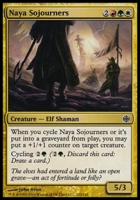 When you cycle Naya Sojourners or it dies, you may put a +1/+1 counter on target creature.