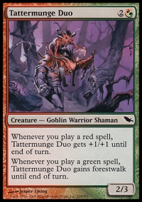 Whenever you cast a green spell, Tattermunge Duo gains forestwalk until end of turn.