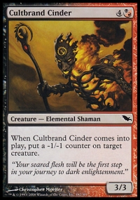 When Cultbrand Cinder enters the battlefield, put a -1/-1 counter on target creature.