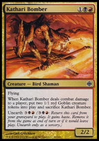 When Kathari Bomber deals combat damage to a player, put two 1/1 red Goblin creature tokens onto the battlefield and sacrifice Kathari Bomber.