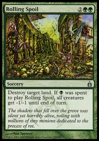 Destroy target land. If {B} was spent to cast Rolling Spoil, all creatures get -1/-1 until end of turn.