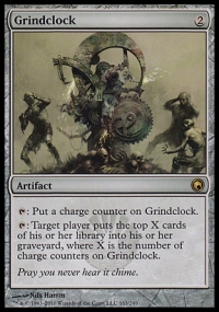 {T}: Target player puts the top X cards of his or her library into his or her graveyard, where X is the number of charge counters on Grindclock.