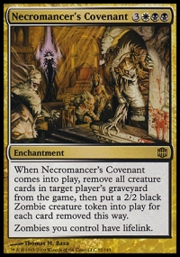 When Necromancer's Covenant enters the battlefield, exile all creature cards from target player's graveyard, then put a 2/2 black Zombie creature token onto the battlefield for each card exiled this way.