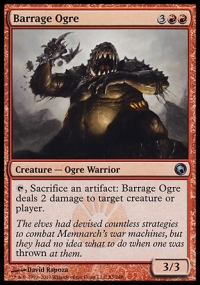 {T}, Sacrifice an artifact: Barrage Ogre deals 2 damage to target creature or player.