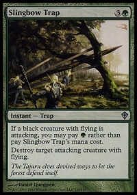 If a black creature with flying is attacking, you may pay {G} rather than pay Slingbow Trap's mana cost.