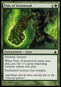 When Fists of Ironwood enters the battlefield, put two 1/1 green Saproling creature tokens onto the battlefield.
