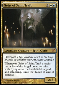 Whenever Geist of Saint Traft attacks, put a 4/4 white Angel creature token with flying onto the battlefield tapped and attacking. Exile that token at end of combat.