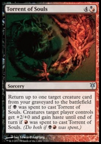Return up to one target creature card from your graveyard to the battlefield if {B} was spent to cast Torrent of Souls. Creatures target player controls get +2/+0 and gain haste until end of turn if {R} was spent to cast Torrent of Souls.