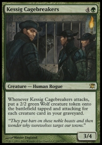 Whenever Kessig Cagebreakers attacks, put a 2/2 green Wolf creature token onto the battlefield tapped and attacking for each creature card in your graveyard.