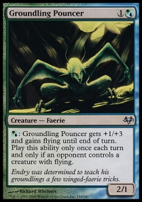 {G/U}: Groundling Pouncer gets +1/+3 and gains flying until end of turn. Activate this ability only once each turn and only if an opponent controls a creature with flying.