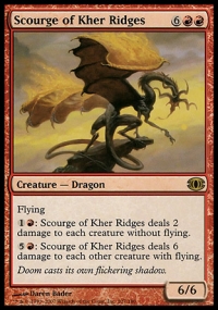 {5}{R}: Scourge of Kher Ridges deals 6 damage to each other creature with flying.
