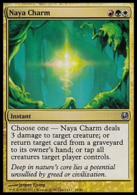 Choose one — Naya Charm deals 3 damage to target creature; or return target card from a graveyard to its owner's hand; or tap all creatures target player controls.