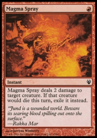 Magma Spray deals 2 damage to target creature. If that creature would die this turn, exile it instead.