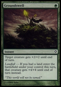 Landfall — If you had a land enter the battlefield under your control this turn, that creature gets +4/+4 until end of turn instead.