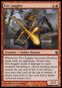 Whenever Fire Juggler becomes blocked, clash with an opponent. If you win, Fire Juggler deals 4 damage to each creature blocking it.