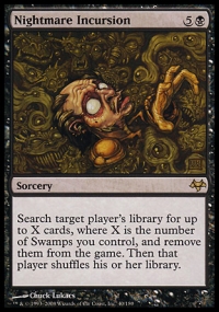 Search target player's library for up to X cards, where X is the number of Swamps you control, and exile them. Then that player shuffles his or her library.