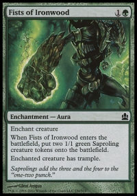 When Fists of Ironwood enters the battlefield, put two 1/1 green Saproling creature tokens onto the battlefield.