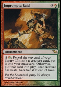 {2}{R/G}: Reveal the top card of your library. If it isn't a creature card, put it into your graveyard. Otherwise, put that card onto the battlefield. That creature gains haste. Sacrifice it at the beginning of the next end step.